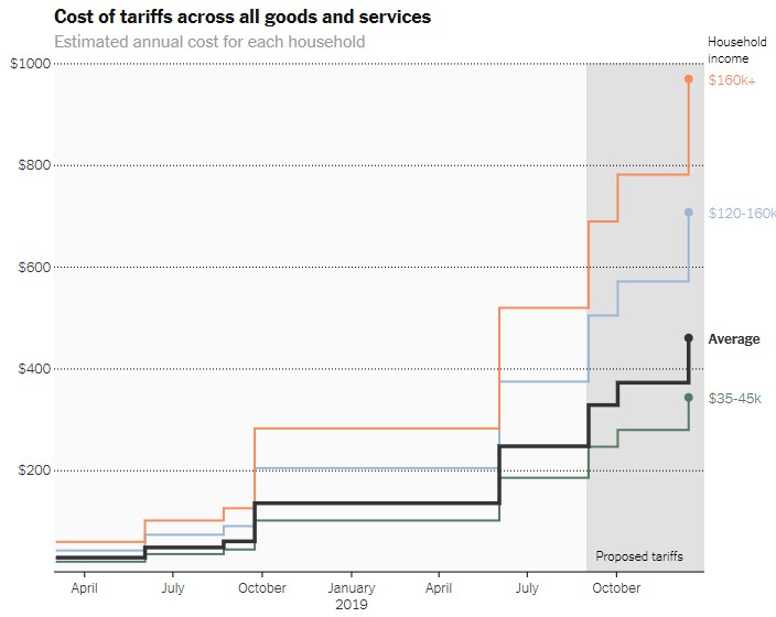As the US enters day 443 of the trade war with China, American consumers and businesses are starting to feel the effects of this prolonged dispute. According the New York Times, the average household will see an increase on average of $460 over the course of a year (chart below) as a result of the cost of tariffs being passed on to customers.
