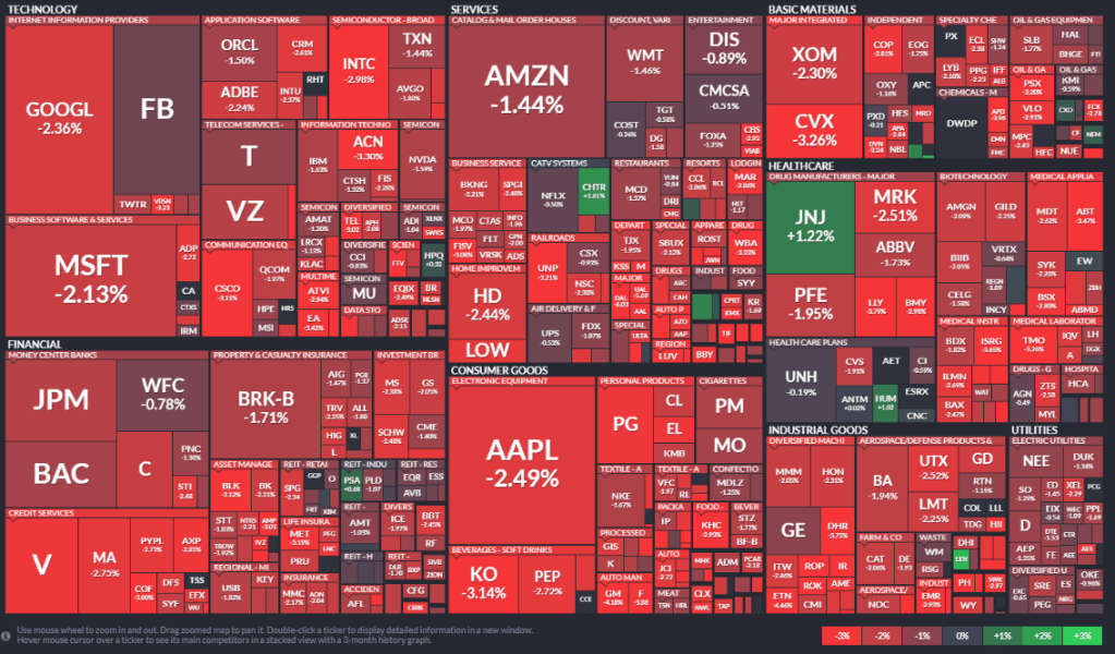As we all know, red is an indication of negative movement and green is movement in the positive direction. However, the most interesting aspect of this heat map is how much of it is red. This is an example of the market and consumer having concerns. The market is on edge and the lower than expected jobs report is just the latest issue for investors. As it stands today, every sector and almost all companies are down for the day.